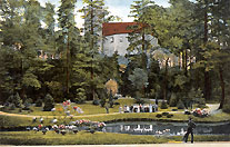Einfahrenden hebt sich auf felsigem Gestein eine wohlerhaltene Burg. Dunkler Efeu umrankt Fels und Gemäuer, riesige Schwarztannen wölben ihre Äste unterhalb ineinander. Ihren Stämmen leuchten im Halbkreis dichte