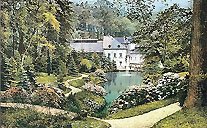 Blütenkelche in dem länglichen Teich zunächst der Durchfahrt spiegeln. Links an dieser ragt ein dunkles Waltgebirge empor, an dessen Fuße sich