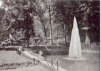 ein offener Pavillon über Rasenstufen erhebt. Blumengeländer führen hinauf, weiße Steinsitze bieten den Vorübergehenden Ruhe und sanfte Kühlung. Fern herüber hört man das Rauschen eines Wasserfalls, den der